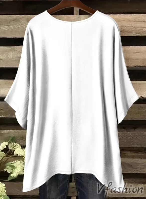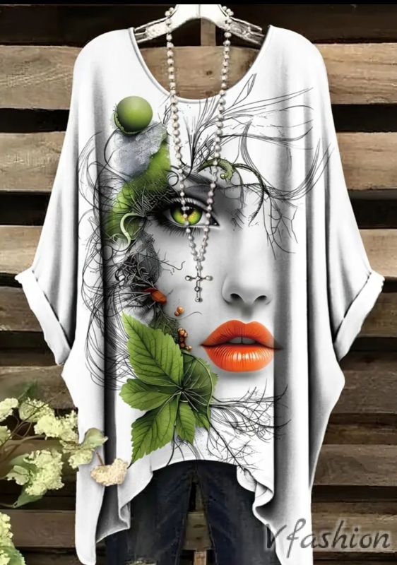 Много удобна и актуална блуза с принт жена на бял фон.