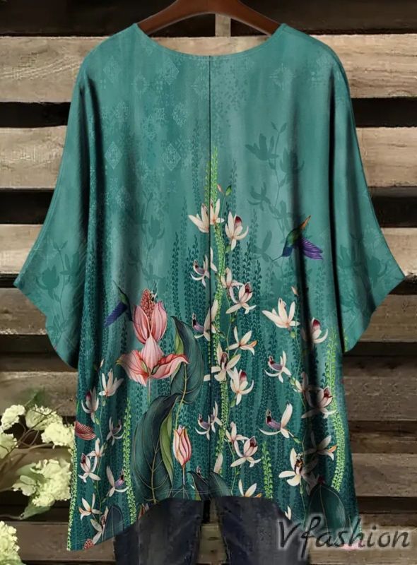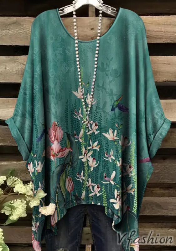Много удобна и актуална блуза с принт красиви цветя на зелен фон.