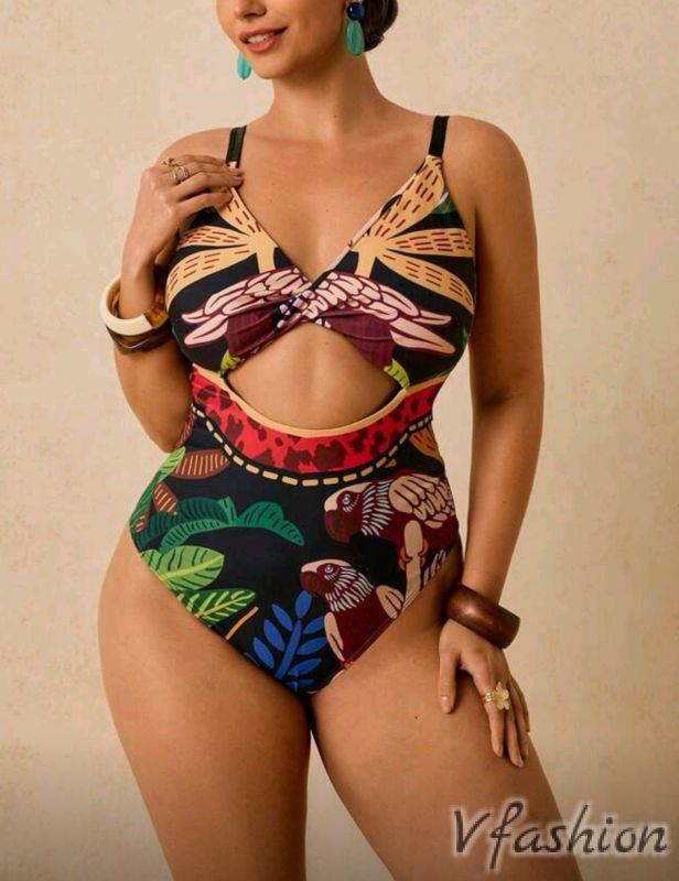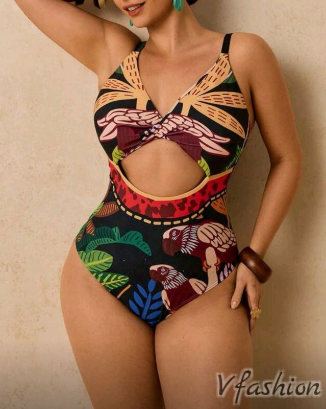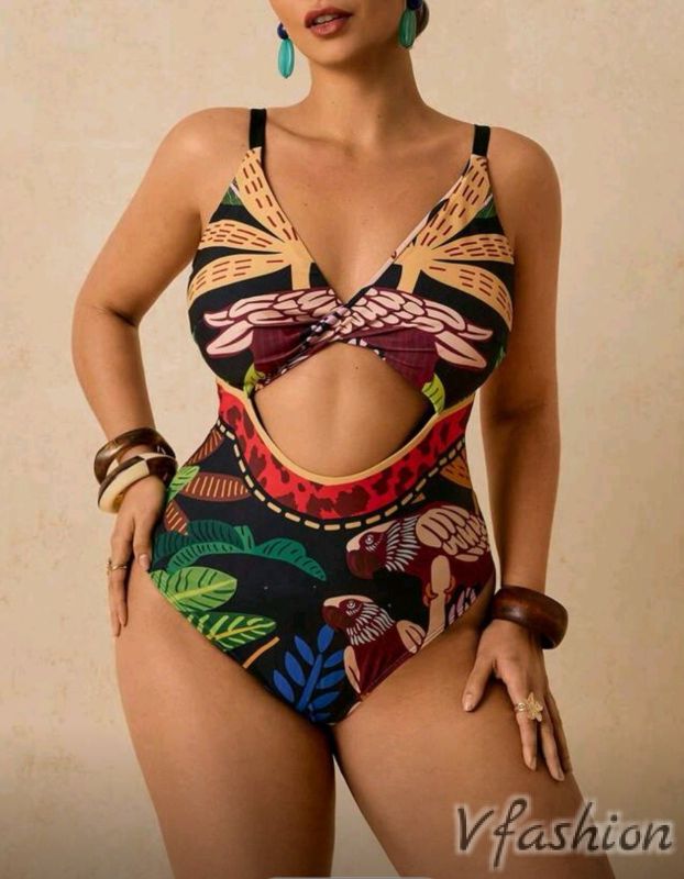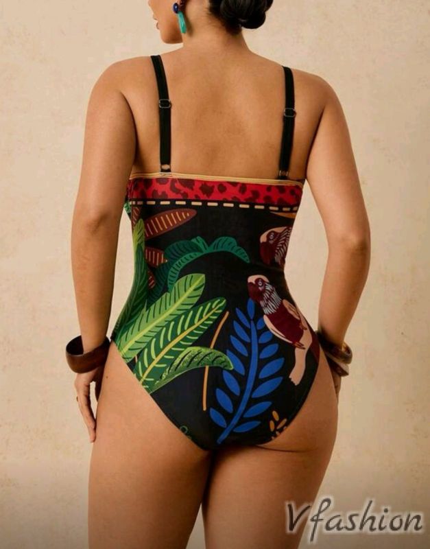 Бански костюм с тропически принт и интересна кройка. Материята е много качествена и еластична.