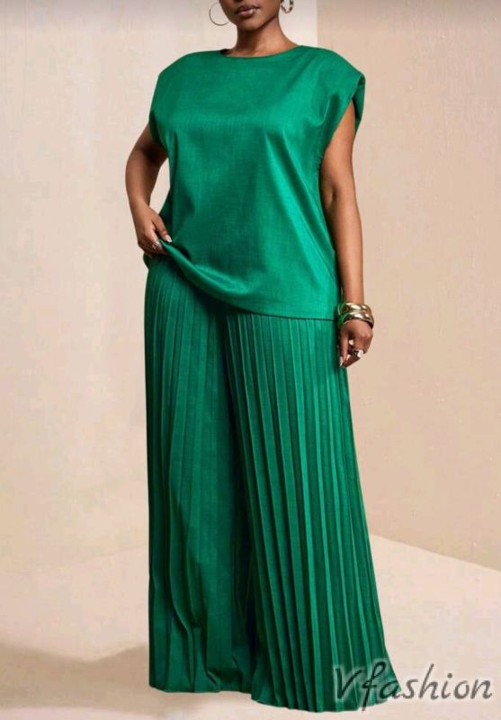 Стилен, спортно-елегантен комплект от плисиран панталон и блуза.Материята не е сатенена, можете да я видите на една от снимките.