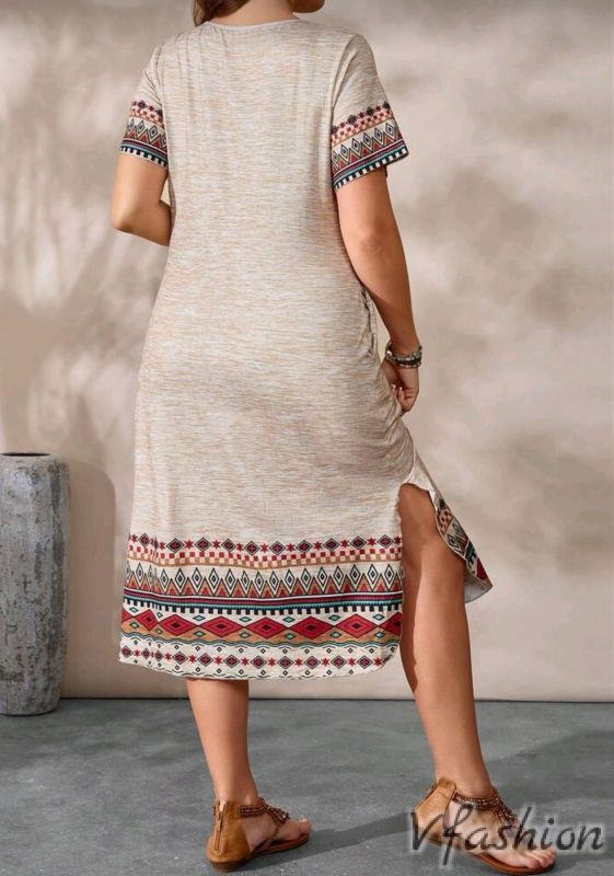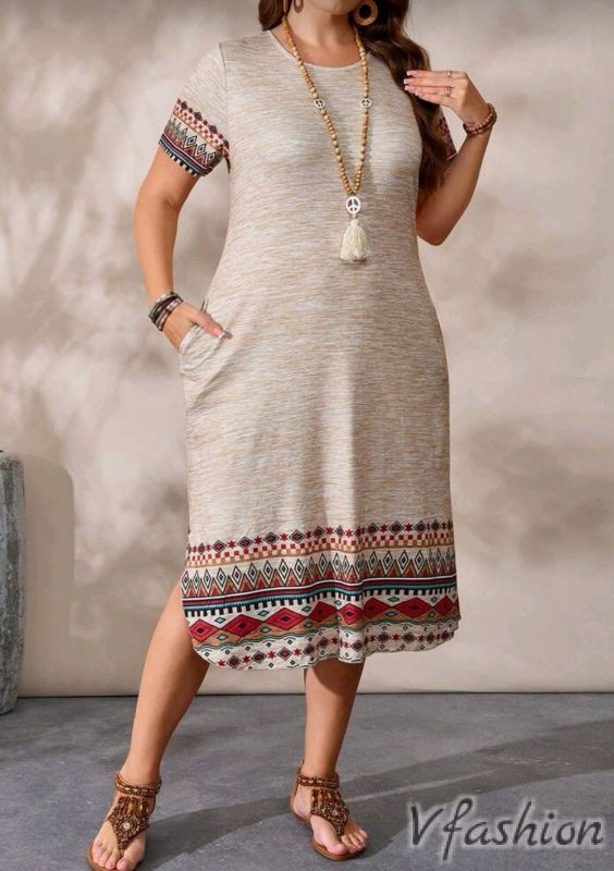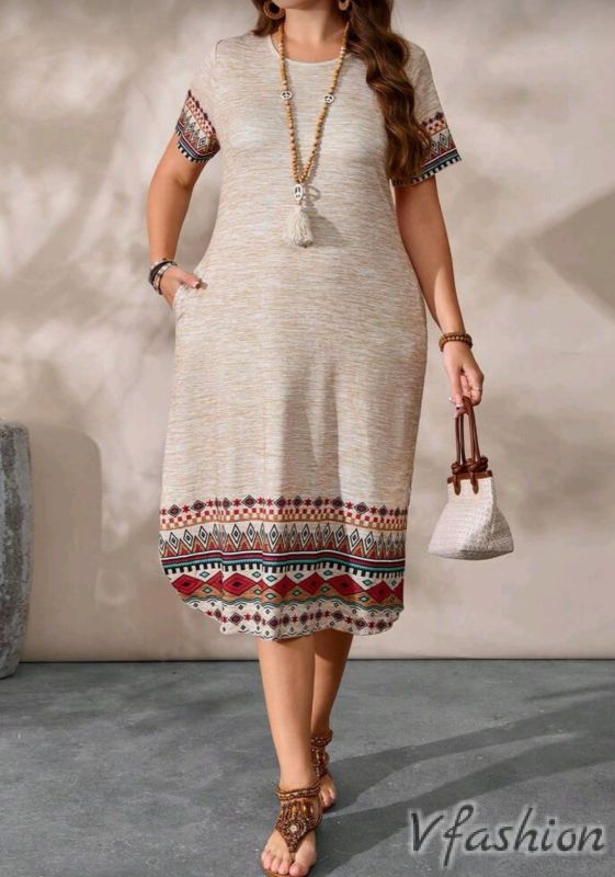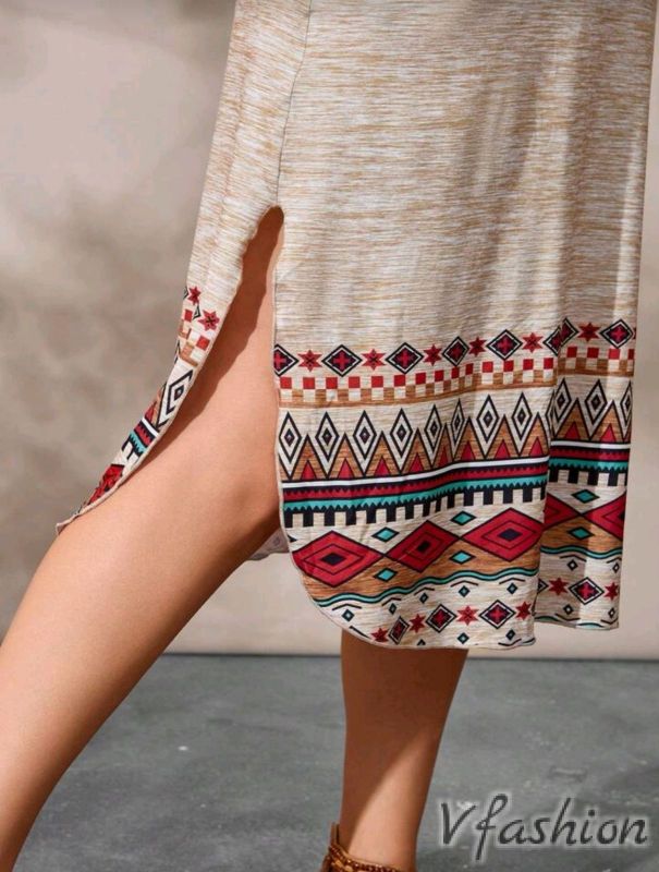 Лятна рокля от еластична материя с принт в бохо стил. Роклята има странични джобове.