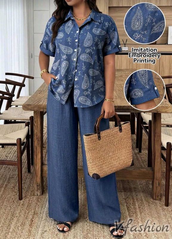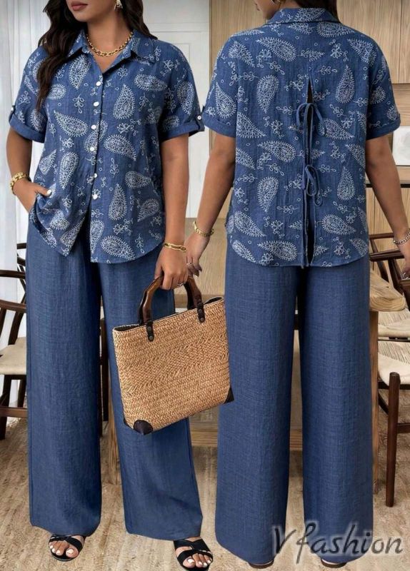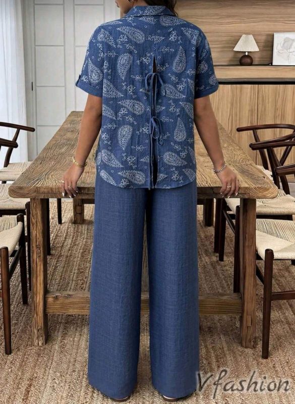 Спортно-елегантен комплект от панталон и риза с принт.