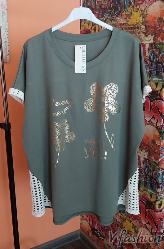 Спортно-елегантен комплект от панталон солей и блуза със златист принт. Цветът на панталона и блузата е един и същ. Материята е еластична.