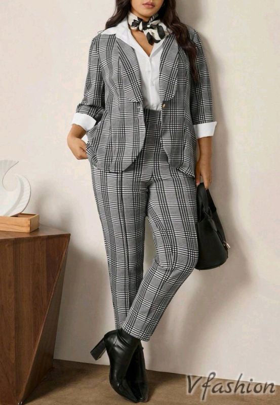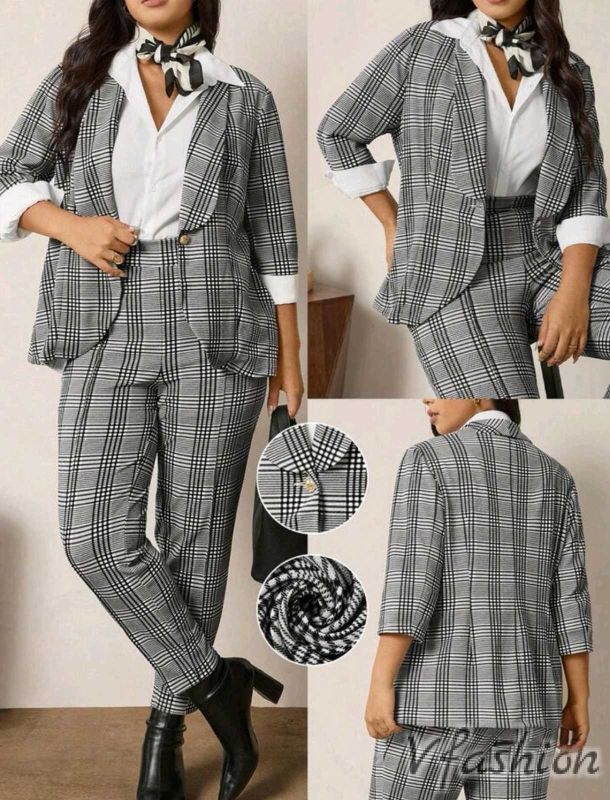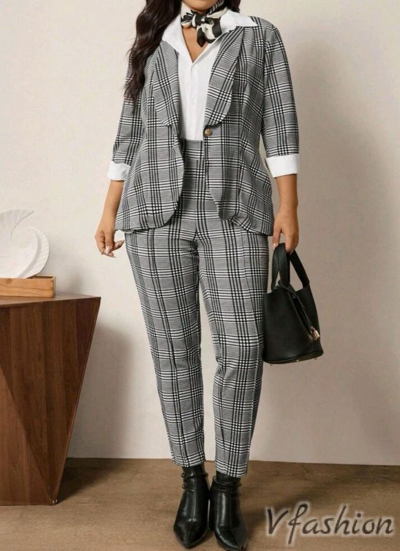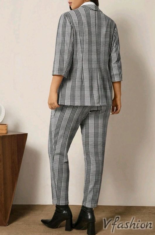 Много стилен комплект от панталон и сако в сиво каре.