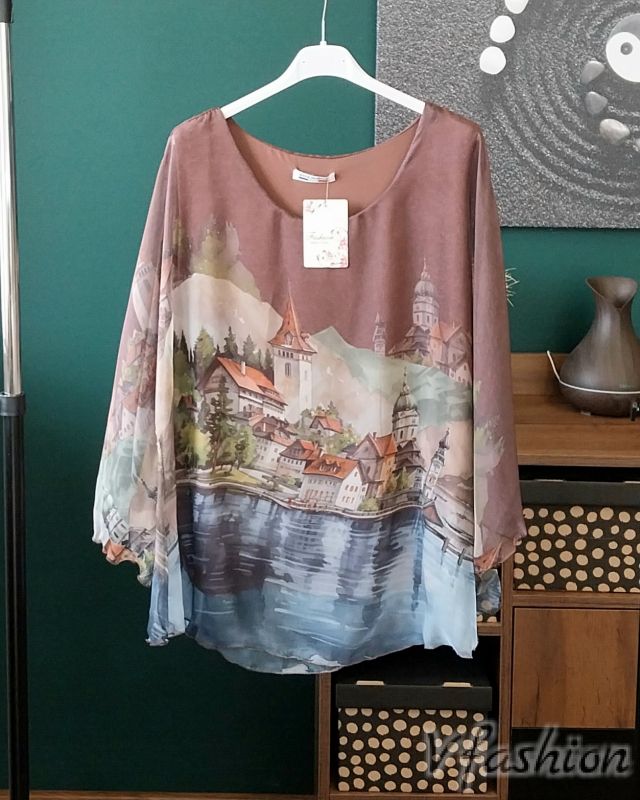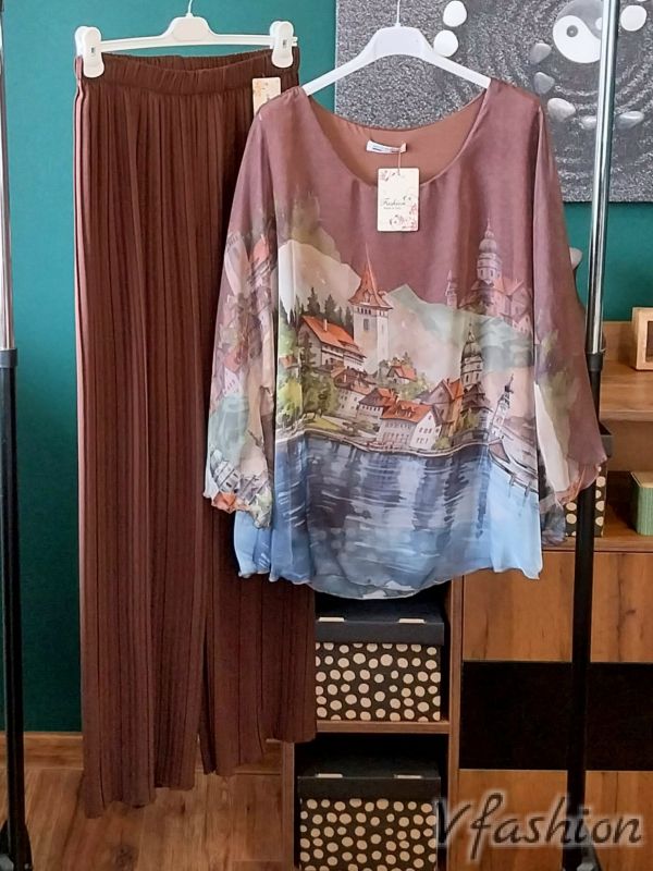 Елегантен комплект от панталон солей и блуза с подплата и много красив принт. Материята на блузата наподобява много коприна.