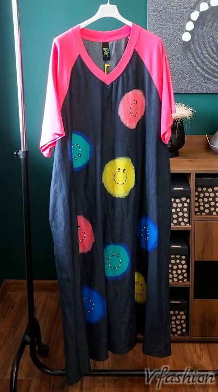 Дънкова рокля с цветни усмивки