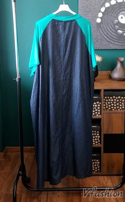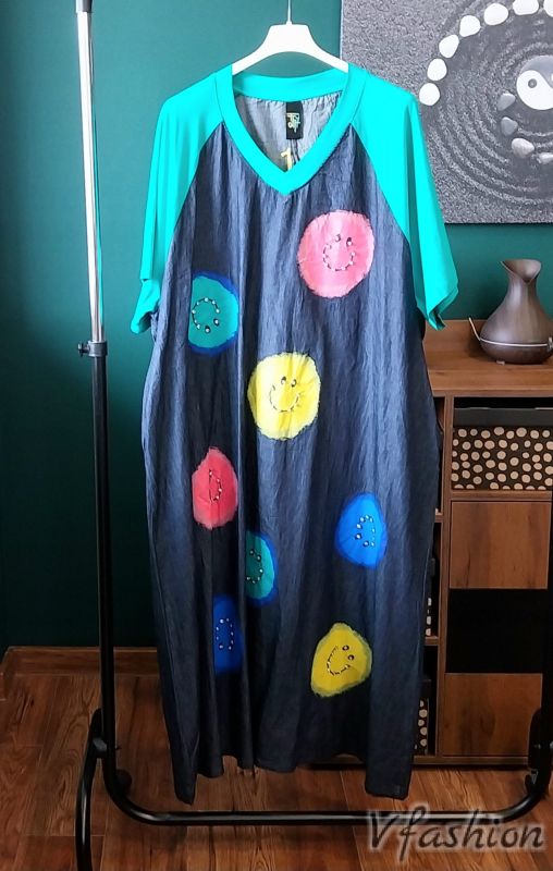 Много актуална, дънкова рокля с принт цветни усмивки. Роклята има удобни, странични джобове.