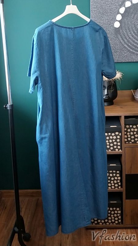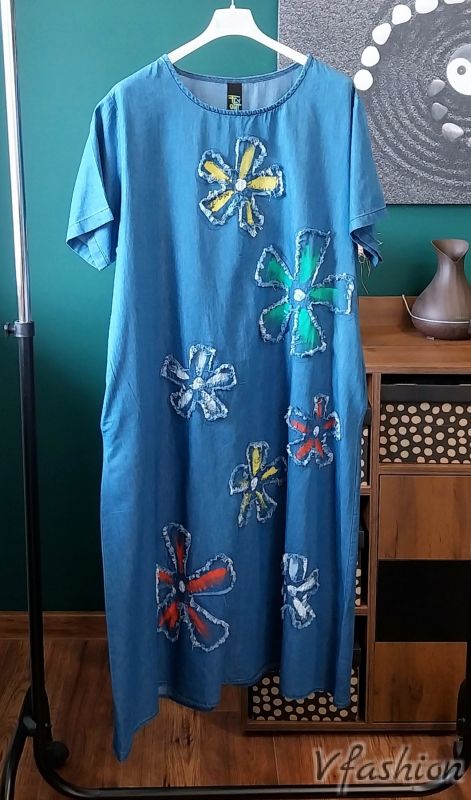 Много актуална, дънкова рокля с пришити цветя. Роклята има удобни, странични джобове.