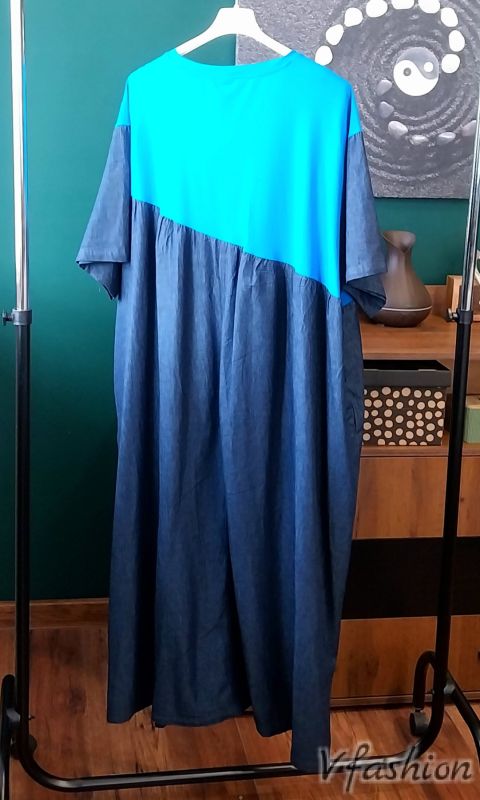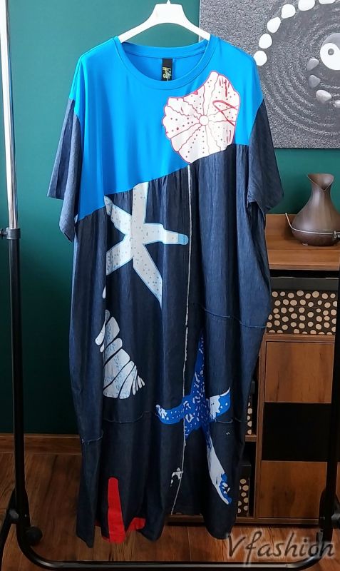 Разкроена, дънкова рокля с морски принт. Роклята има удобни, странични джобове.