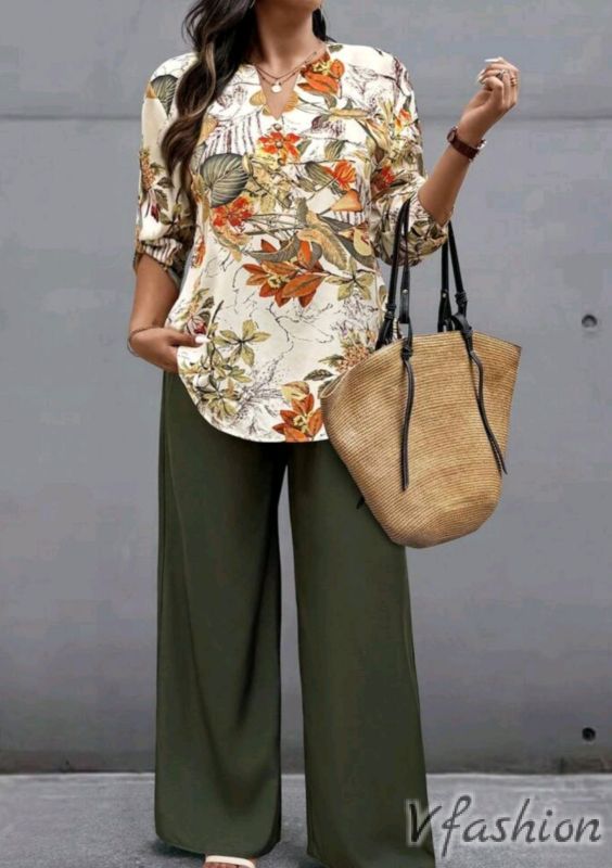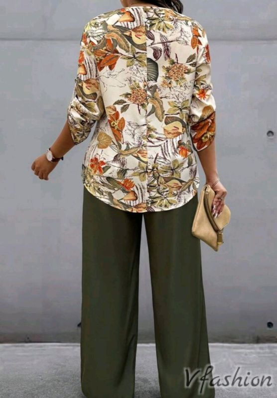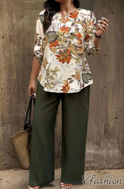 Спортно-елегантен комплект от панталон и блуза с принт листа.