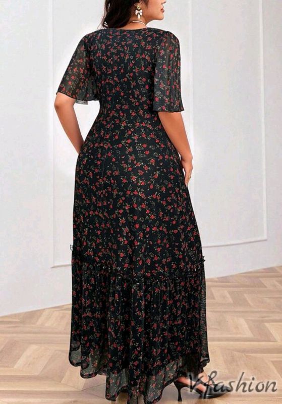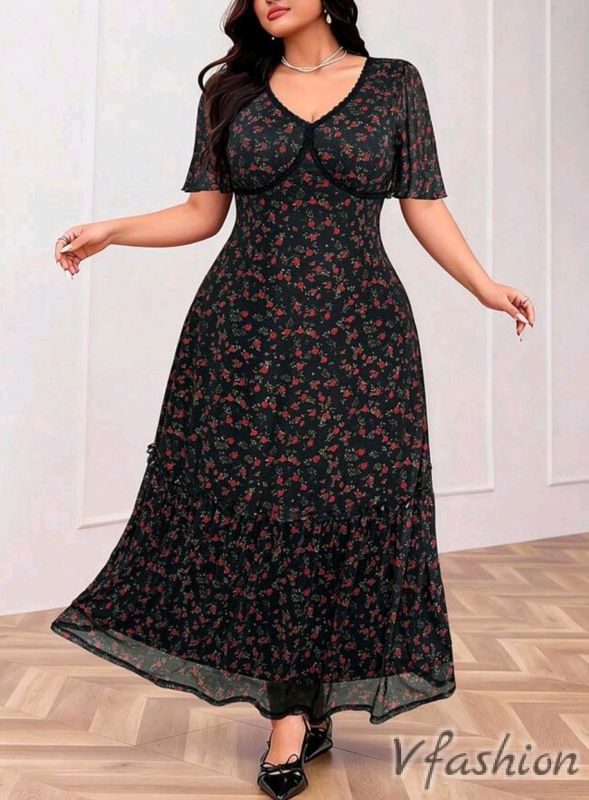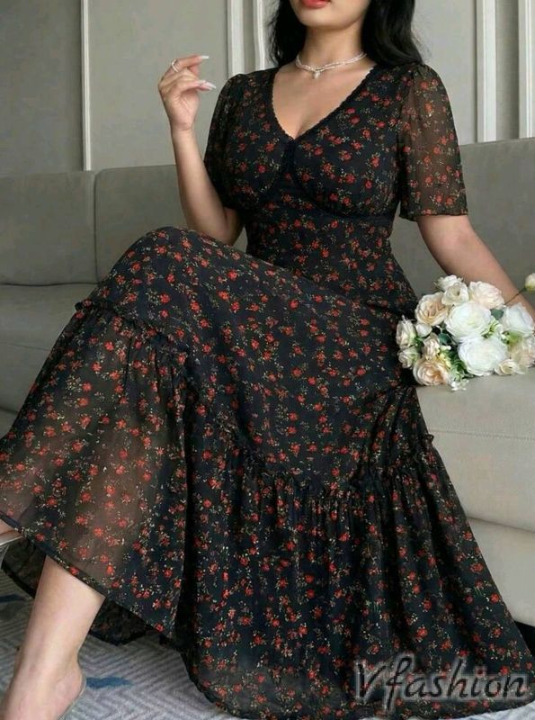 Много кокетна, дълга рокля с принт малки цветчета. Материята е еластична.