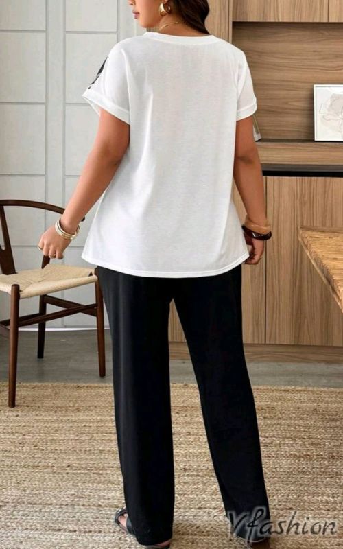 Спортно-елегантен комплект от панталон на ластик и блуза с принт.