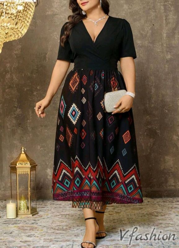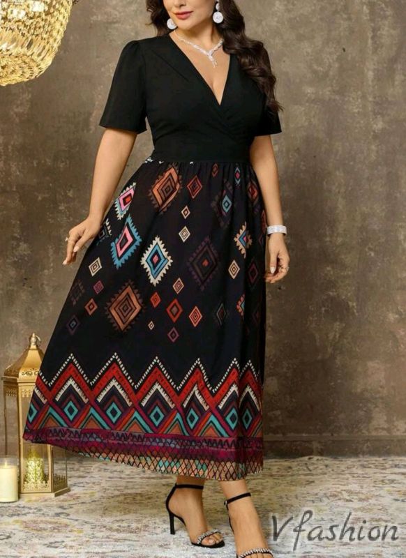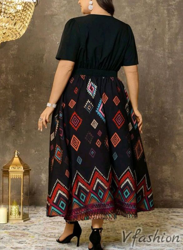 Разкроена, дълга рокля с принт цветни, геометрични фигури.
