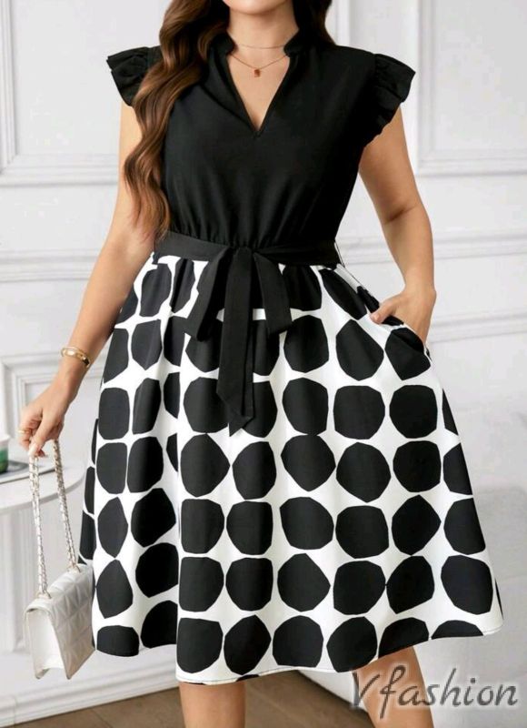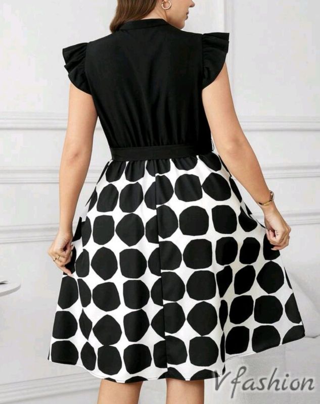 Елегантна, разкроена рокля на точки в долната част. Роклята има коланче от същия плат и удобни джобове.
