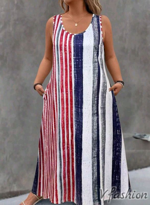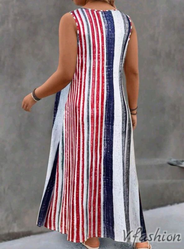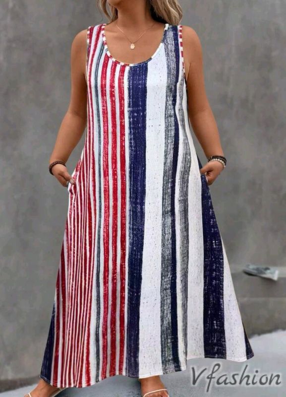 Дълга рокля без ръкави на райета. Роклята има удобни, странични джобове.