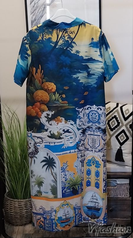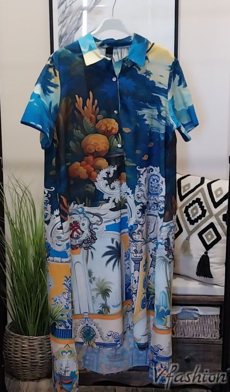 Дълга риза-рокля с издължен гръб и много красив, цветен принт. Роклята има удобни, странични джобове.