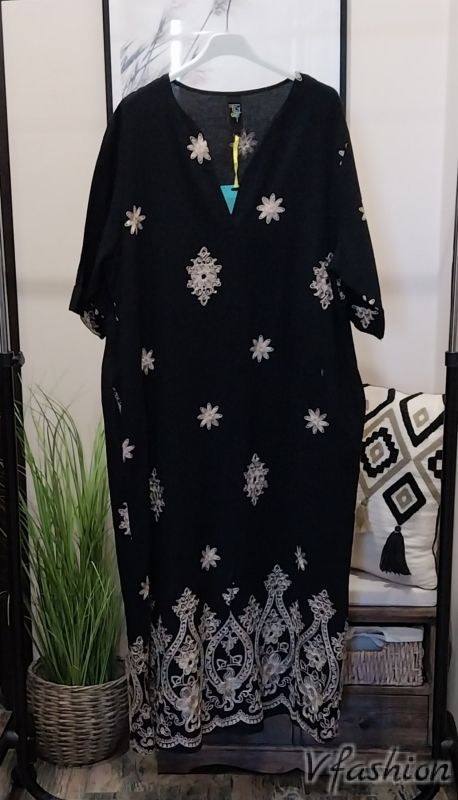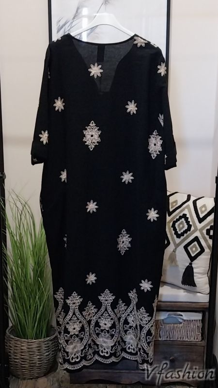 Дълга рокля от памучен плат с много красиви бродерии. Роклята има удобни, странични джобове.