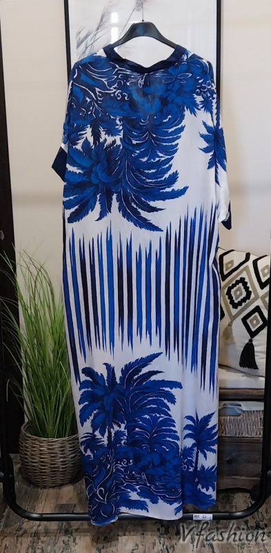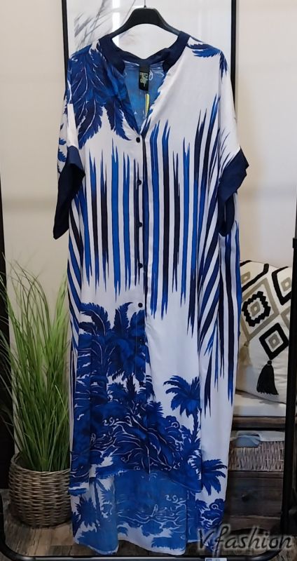 Дълга, лятна риза-рокля с издължен гръб и принт в синьо на бял фон. Роклята има удобни, странични джобове.