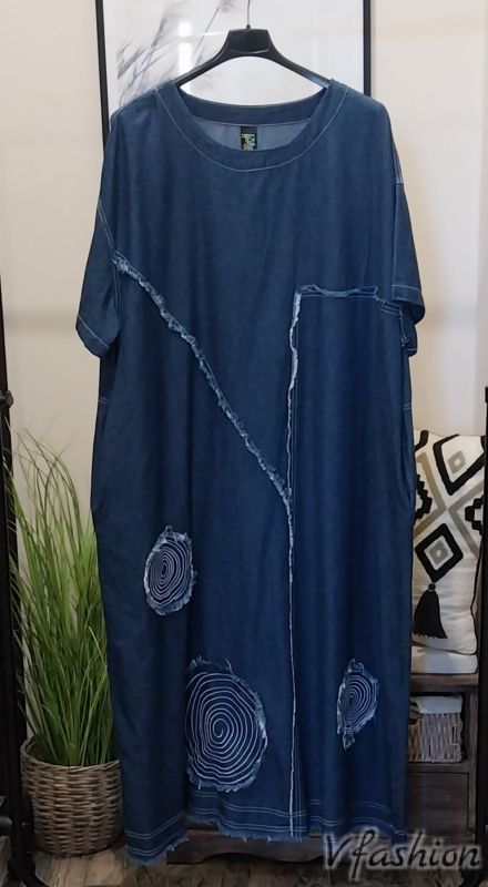 Ежедневна, дънкова рокля с пришити дънкои парчета плат. Роклята има удобни, странични джобове.