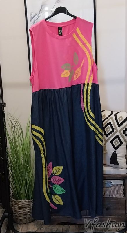 Разкроена рокля, комбинация от дънков и трикотажен плат с цветен принт. Роклята има удобни, странични джобове.