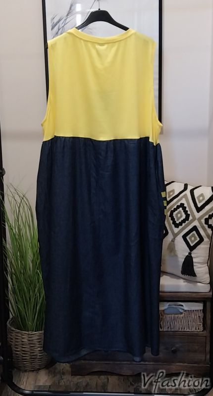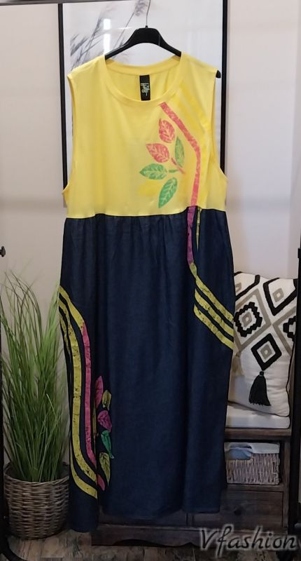 Разкроена рокля, комбинация от дънков и трикотажен плат с цветен принт. Роклята има удобни, странични джобове.